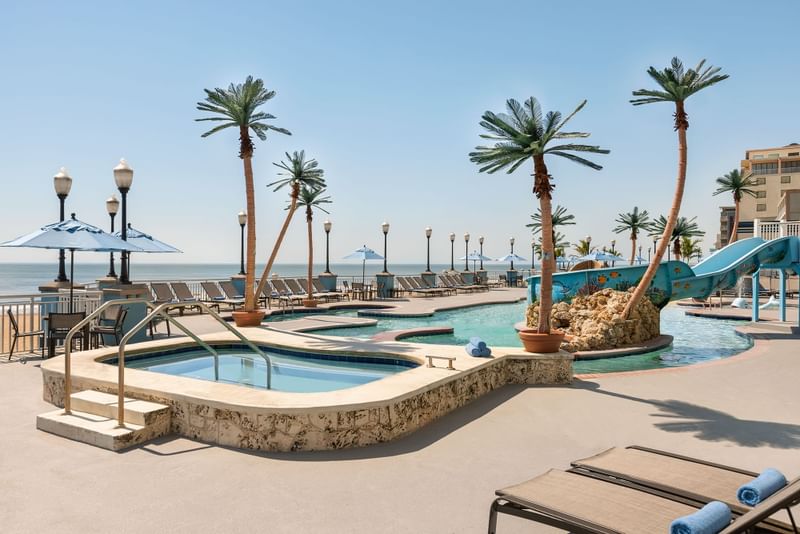 Two elevated pools, with a pool bar and grill, overlook the spectacular beach scene. Kids of all ages can enjoy the large activity pool featuring slides, fountains, and a lazy river. There's also an oversized hot tub, a large heated indoor swimming pool, a state-of-the-art fitness center,